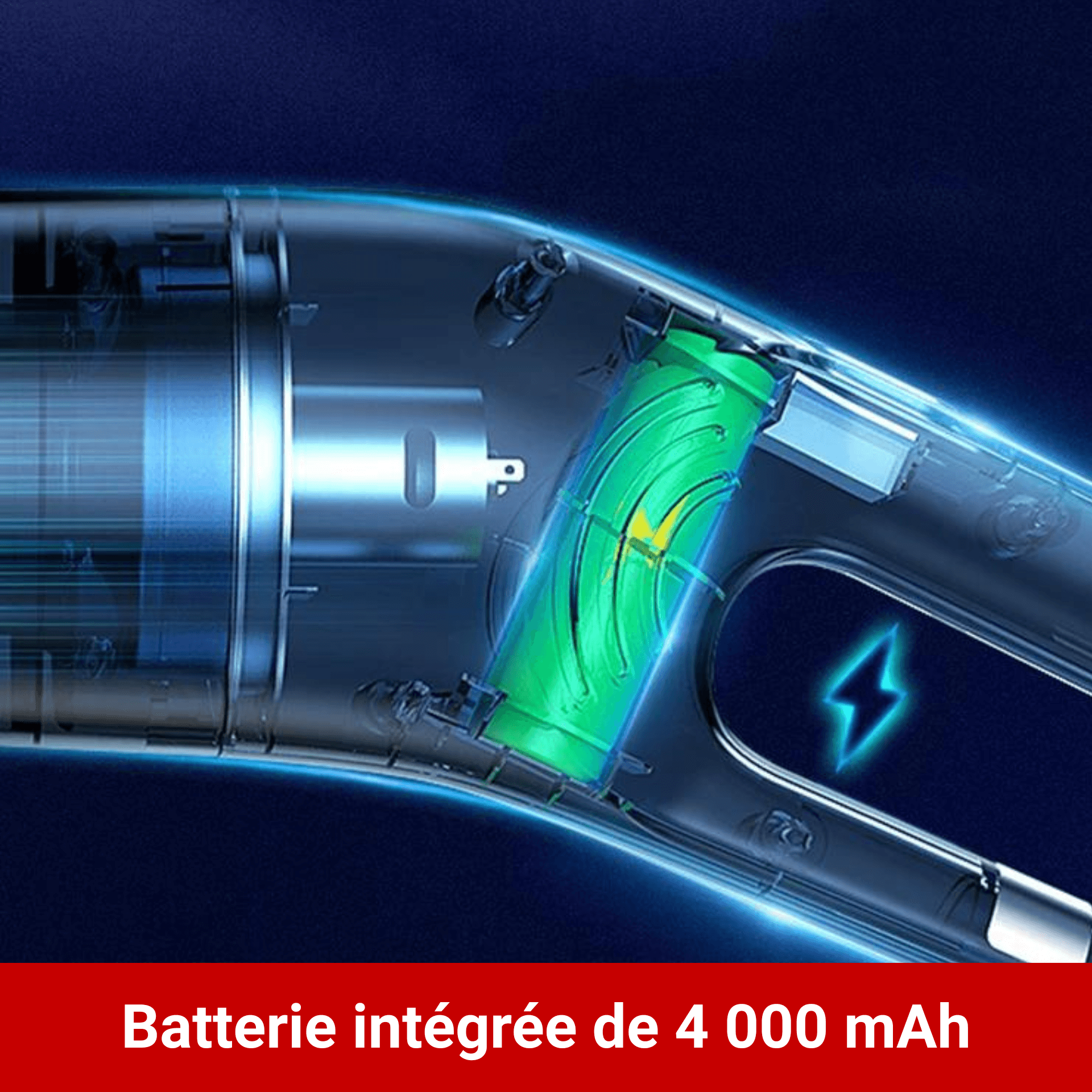 Une batterie de 2 x 2000mAh est intégrée dans l’aspirateur lui permettant d’avoir entre 20 et 30 min d’autonomie.