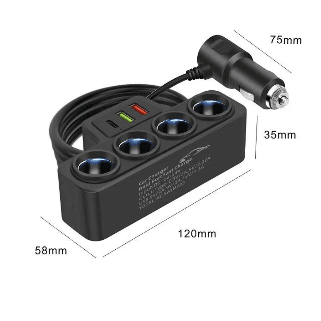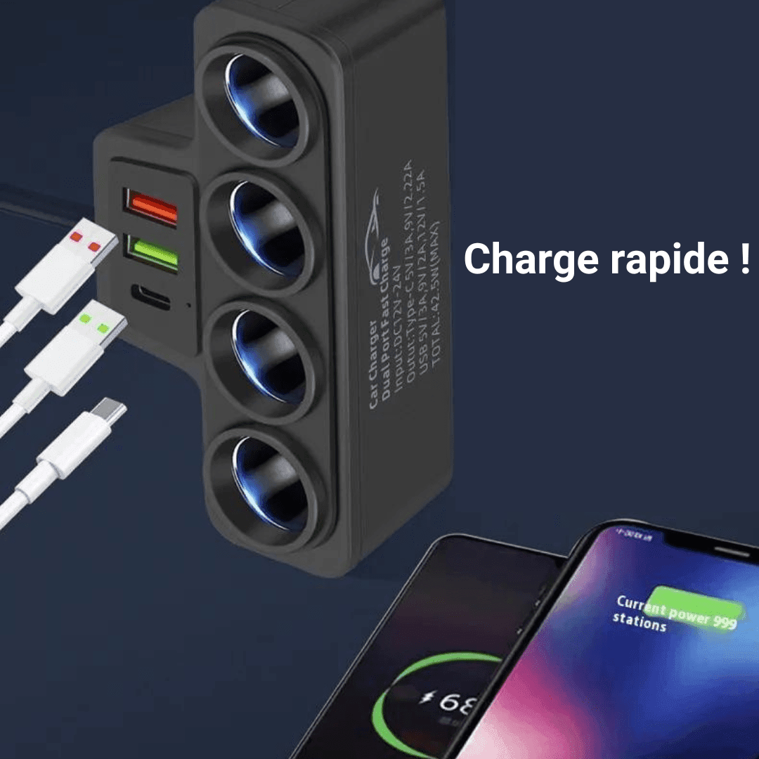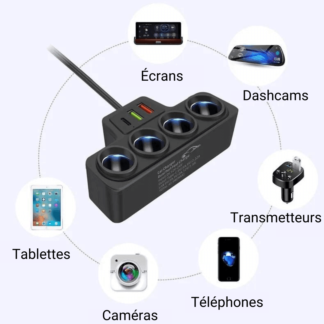 Multiprise Allume-Cigare 4 Entrées Haute Puissance – Hub Auto avec Ports USB et USB Type-C Rapide – Pour GPS et Dashcam